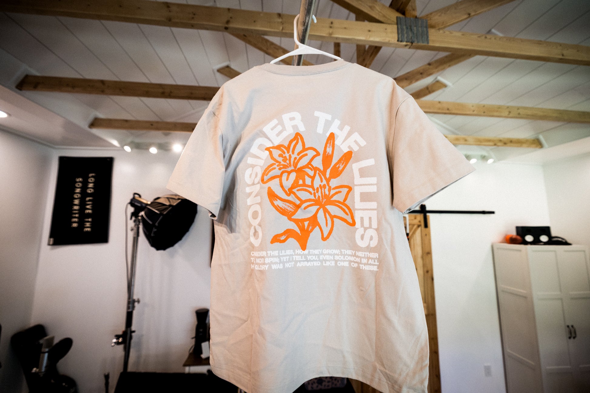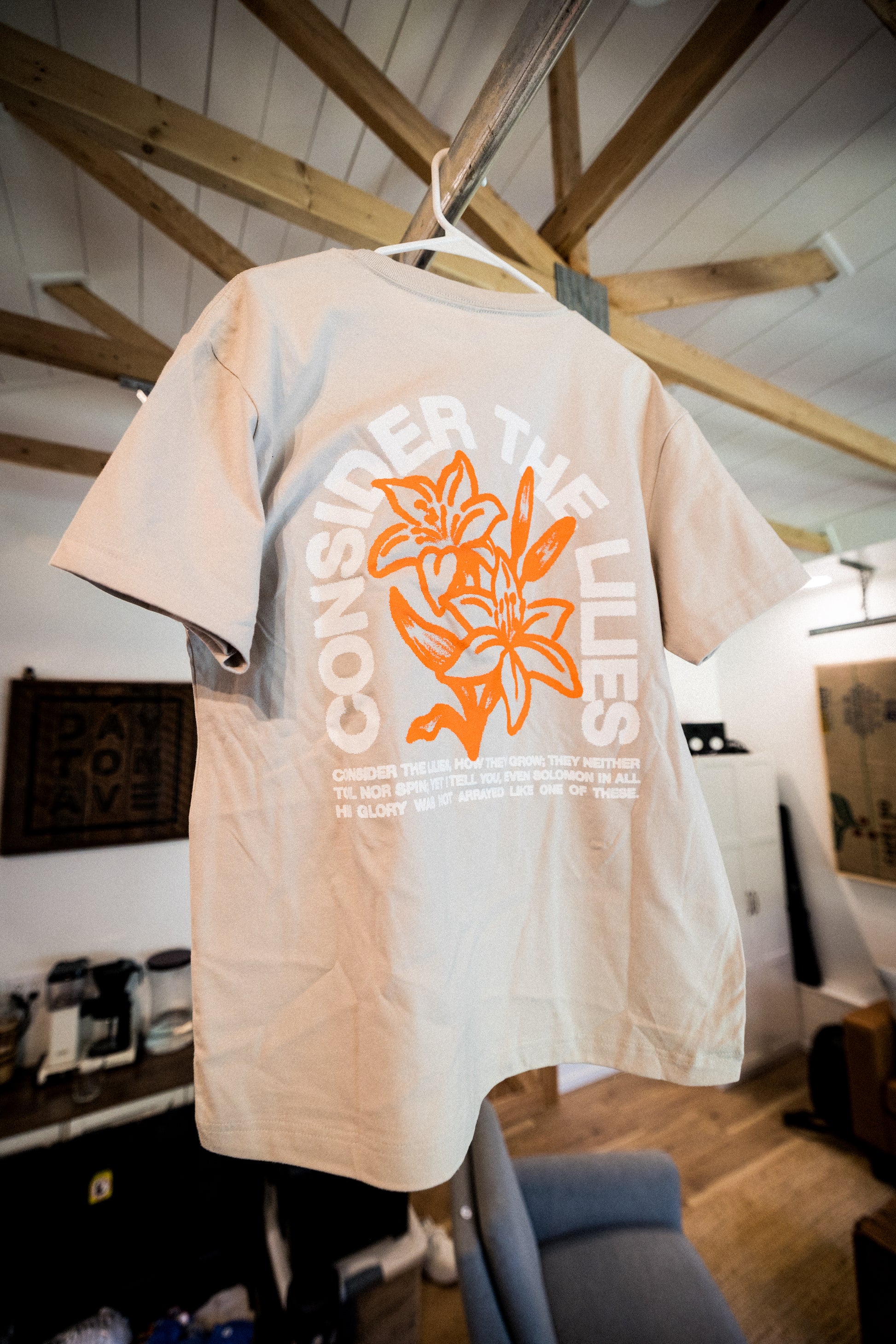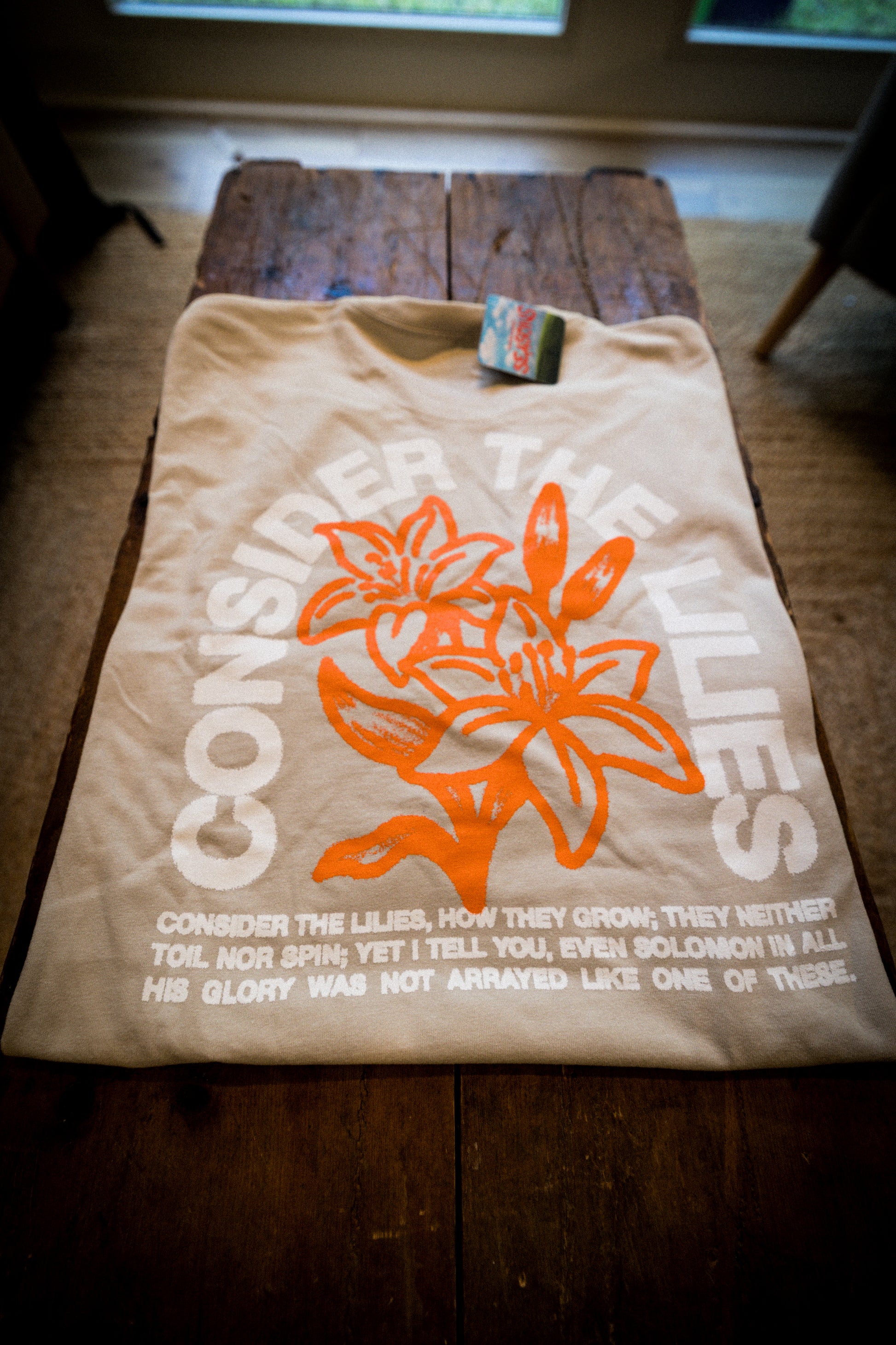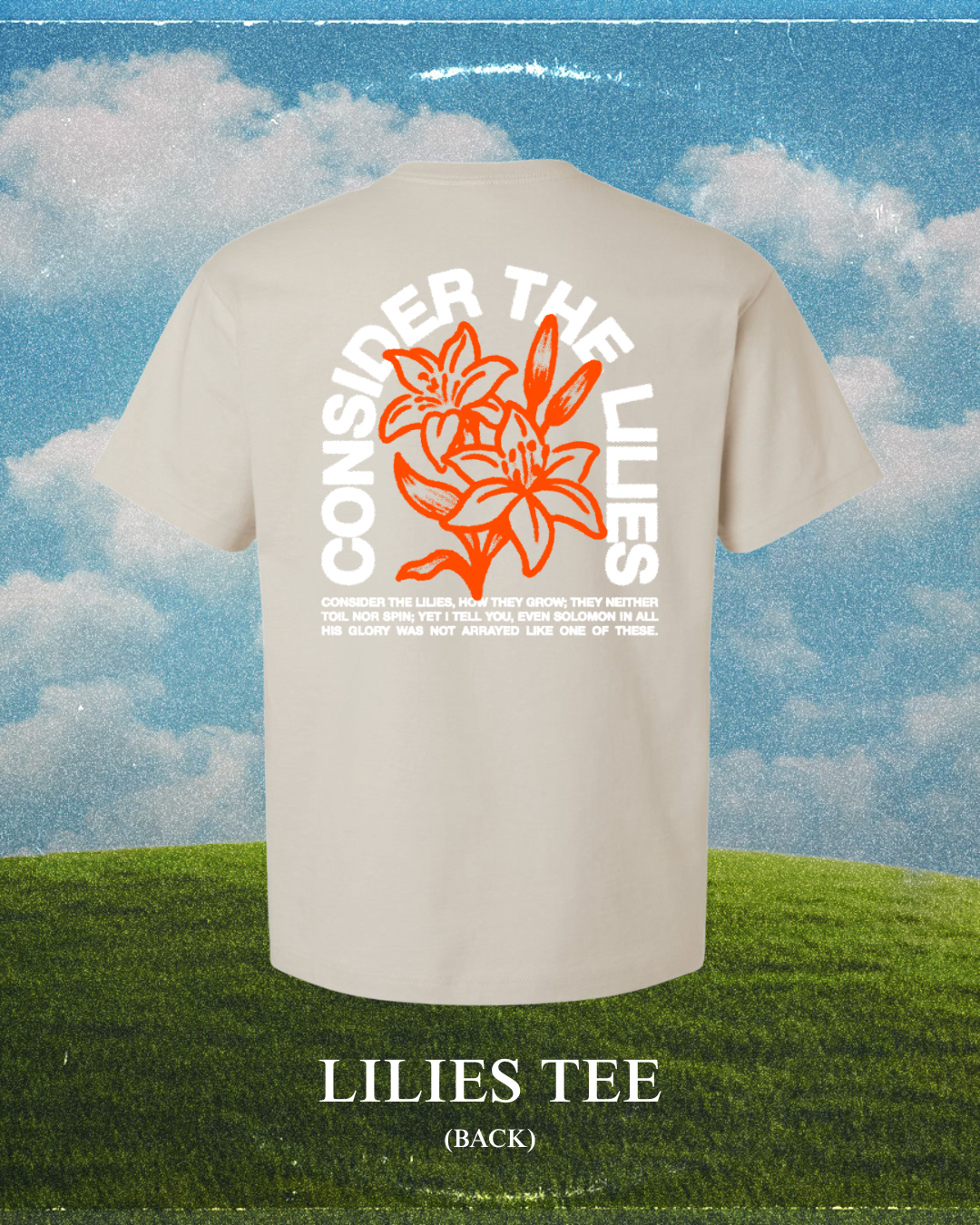 Find peace in the pursuit with our Lilies Tee, featuring the timeless wisdom of Matthew 6:28-29: "Consider the lilies of the field, how they grow: they neither toil nor spin; and yet I say to you that even Solomon in all his glory was not arrayed like one of these."